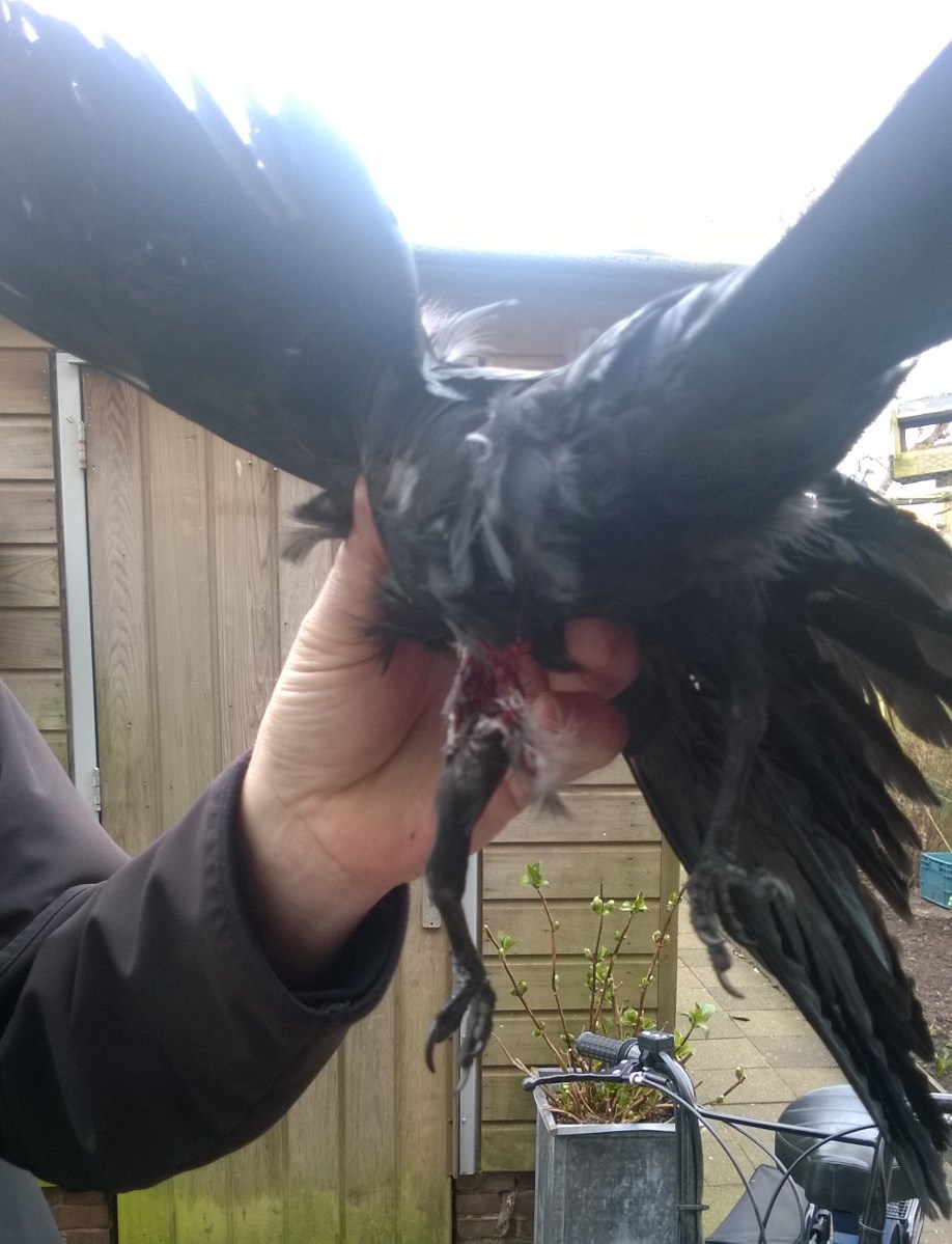 Een in de poot geschoten kauw. Foto: familie Frowein.